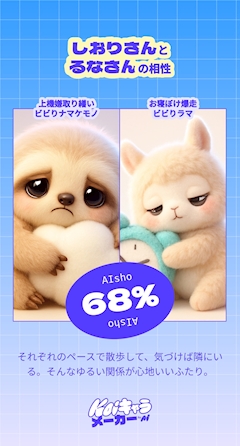 みなさんおはこんばんにちはーるなママです✨️ koiキャラやったよーー! 私はねー お寝ぼけ暴走びびりラマだったw なんだそれって感じだよねw あながち間違ってない所が面白い 親友と相性が60%超えてて良かったです😊