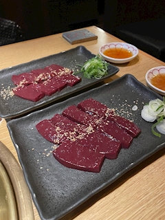 こんばんは🐷 こころです! 今日と明日休みです! 今日は焼肉屋さんに来ています! 新鮮レバー✨ 大好きだから2皿も注文したよ🌟 ごま油が付いてるからお察しの通り🤫💖 寝ても覚めても焼肉で頭がいっぱいです!😆 そして今日は苦手な豚足に挑戦! 共食いじゃないよ?やめてね?笑 だれが前足じゃボケーい!ブヒブヒ!🐽🐽